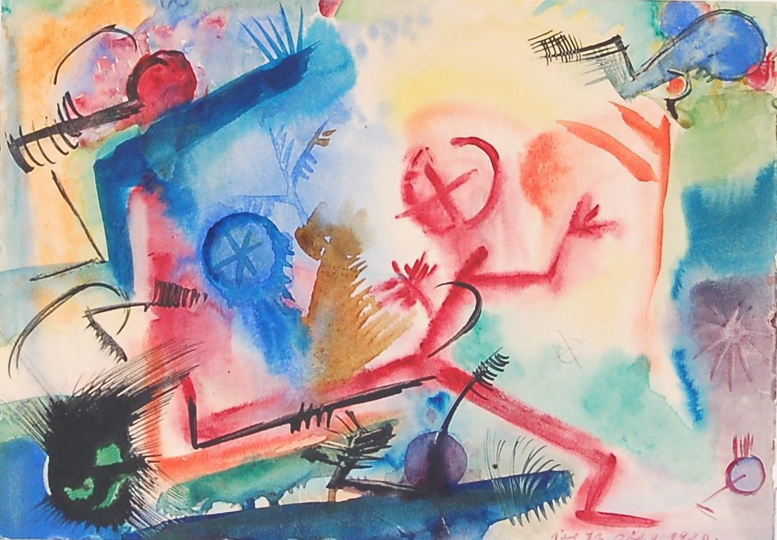 Karl Peter Röhl stilisierte sie in der Art eines Strichmännchens. Die Position im Mittelpunkt eines Kreises mit gespreizten Armen und Beinen in strenger Symmetrie nimmt möglicherweise Bezug auf Leonardo da Vincis vitruvianischen Menschen, freilich ohne die Ursprungsidee der idealisierten Proportionen und ohne Bezug auf die Quadratur des Kreises. Röhl verwandte Symbole unterschiedlichster weltanschaulicher und religiöser Provenienz und versah den Stempel mit der komplexen Bildsprache seiner ‚kosmischen‘ Werke des Jahres 1919, etwa dem Stern oder einem Kometen, außerdem einem Sonnenrad.4 Annemarie Jaeggi schrieb mit Blick auf die Verwendung der Bauhütten-Symbolik am frühen Bauhaus: „Das […] Sternenmännchen trägt die Stufenpyramide, umgeben von der Sonne und einem siebeneckigen Stern sowie einem linksdrehenden Hakenkreuz und weiteren, runenartigen Zeichen. Thematisiert wird der kosmische Ursprung des Menschen, die Synthese der Gegensätze – Tag und Nacht, Mann und Frau, Schwarz und Weiß. Die Pyramide ist hierbei auch als nach oben gerichtetes Dreieck, dem Zeichen für die göttliche Weisheit, und die Stufen als der Weg zur Erkenntnis, dem Streben nach Höherem, zu lesen.“5 Die stilisierte Figur des Sternenmännchens findet sich in einer Werkgruppe stark farbiger Aquarelle von Röhl von 1920 wieder. Mit der Einführung des Sternenmännchens als offiziellem Schulsignet und Siegel drückte Röhl dem Bauhaus buchstäblich seinen Stempel auf.