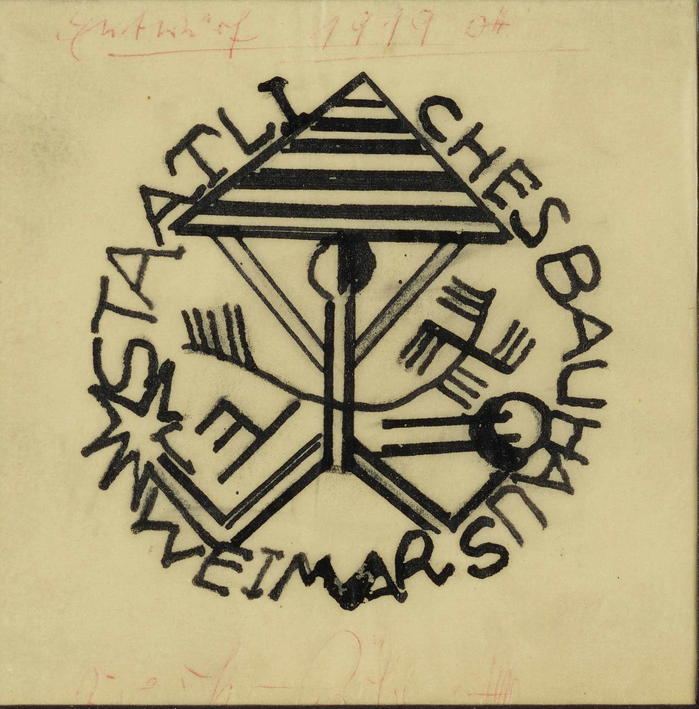 Walter Gropius betrachtete die mittelalterlichen Bauhütten als vorbildhaft für das Bauhaus, weil ihre Arbeit einem architektonischen Gesamtkunstwerk, dem sich Malerei, Plastik und alle gestaltenden Handwerke unterordneten, gegolten hatte. Die Bauhütten-Idee war das Leitmotiv der programmatischen Texte in Manifest und Programm des Staatlichen Bauhauses in Weimar, die am 2. Mai 1919 gedruckt vorlagen. „Das Endziel aller bildnerischen Tätigkeit ist der Bau! Ihn zu schmücken war einst die vornehmste Aufgabe der bildenden Künste, sie waren unablösliche Bestandteile der großen Baukunst.“, hieß es dort.1 Das bekannte Titelblatt Kathedrale von Lyonel Feininger wurde zu einem ikonischen Bild der Moderne. Als Schulsignet war dieses Motiv jedoch nicht geeignet.